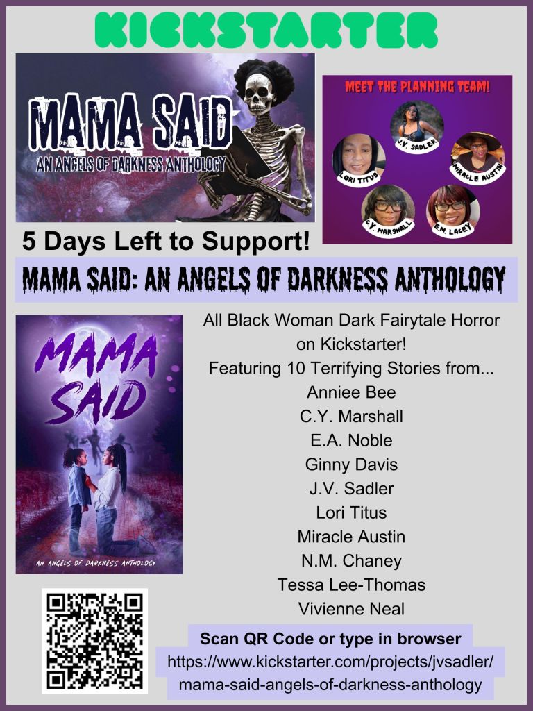 Black Women in Horror Month sends a shout out to our sisters in Angels of Darkness! There’s still 5 more days to help fund the Kickstarter for their up and coming anthology, Mama Said.